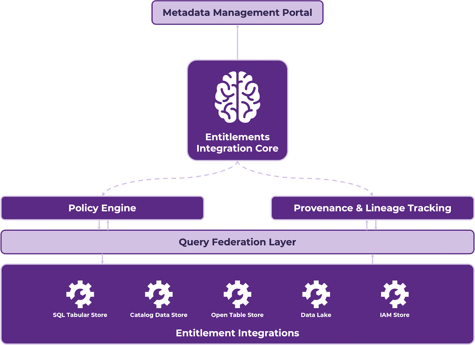 This architecture diverges from the traditional hub-and-spoke model, operating as a federated governance framework. In this model, entitlement decisions are enforced dynamically across multiple platforms without centralizing sensitive data. The Distributed Query Engine plays a crucial role in aggregating results across entitlement sources, ensuring that governance policies are applied at the time of query execution.