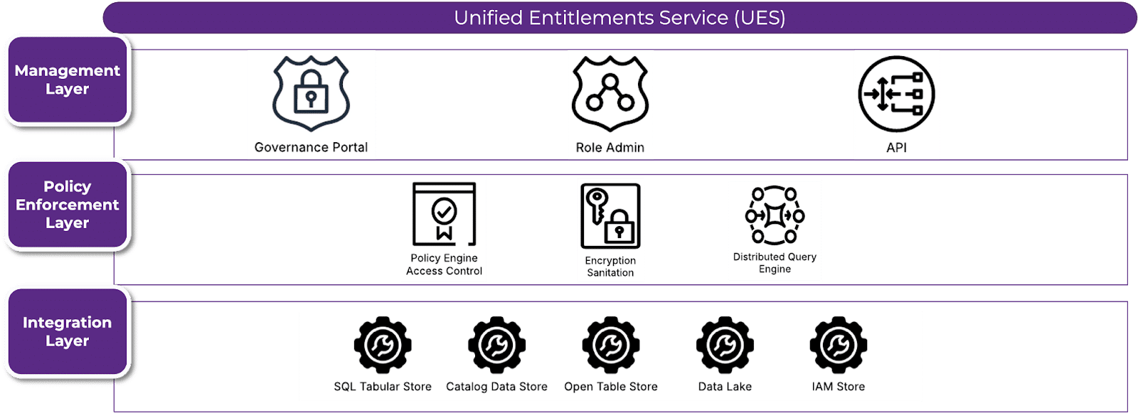 The Unified Entitlement Service employs a layered and federated architecture designed for scalability, interoperability, and governance across enterprise data environments. At its core, the system is structured into distinct layers, each responsible for key functions: